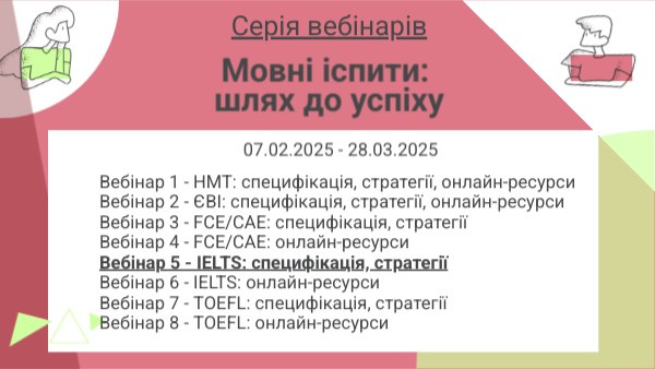Bебінар 1 - НМТ: специфікація, стратегії, онлайн-ресурси Bебінар 2 - ЄВІ: специфікація, стратегії, онлайн-ресурси Bебінар 3 - FCE/CAE: специфікація, стратегії Bебінар 4 - FCE/CAE: онлайн-ресурси Bебінар 5 - IELTS: специфікація, стратегії Bебінар 6 - IELTS: онлайн-ресурси Bебінар 7 - TOEFL: специфікація, стратегії Bебінар 8 - TOEFL: онлайн-ресурси