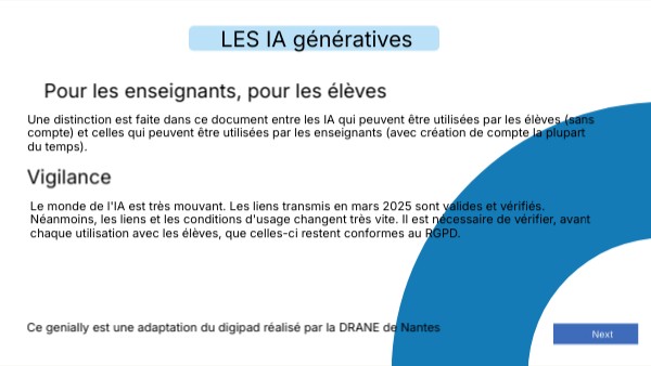 Le monde de l'IA est très mouvant. Les liens transmis en mars 2025 sont valides et vérifiés. Néanmoins, les liens et les conditions d'usage changent très vite. Il est nécessaire de vérifier, avant chaque utilisation avec les élèves, que celles-ci restent conformes au RGPD.