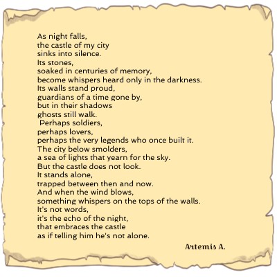 As night falls, the castle of my city sinks into silence. Its stones, soaked in centuries of memory, become whispers heard only in the darkness. Its walls stand proud, guardians of a time gone by, but in their shadows ghosts still walk. Perhaps soldiers, perhaps lovers, perhaps the very legends who once built it. The city below smolders, a sea of lights that yearn for the sky. But the castle does not look. It stands alone, trapped between then and now. And when the wind blows, something whispers on the tops of the walls. It's not words, it's the echo of the night, that embraces the castle as if telling him he's not alone.