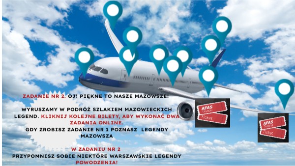 ZADANIE nr 2. OJ! PIĘKNE TO NASZE MAZOWSZE! Wyruszamy w podróż Szlakiem mazowieckich legend. Kliknij kolejne bilety, aby wykonać dwa zadania ONLINE. Gdy zrobisz zadanie nr 1 poznasz legendy Mazowsza W zadaniu nr 2 Przypomnisz sobie niektóre warszawskie legendy powodzenia!