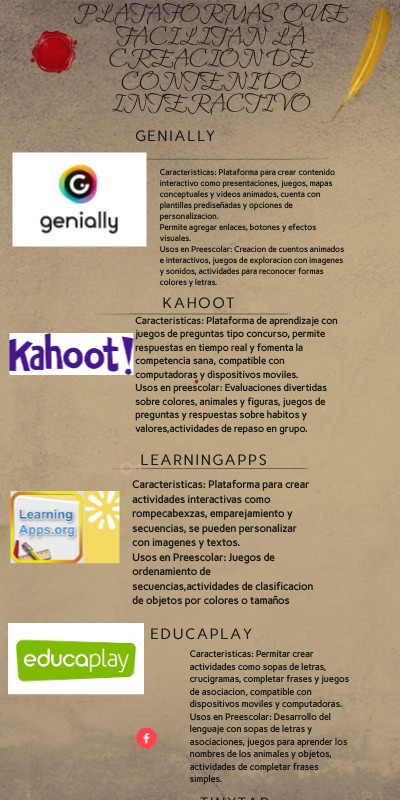 Caracteristicas: Plataforma para crear juegos interactivos como memoria, sopas de letras, adivinanzas y cuestionarios.Usos en preescolar: Juegos de asociacion de imagenes y palabras, actividades de reconocimiento de numeros, letras y figuras.