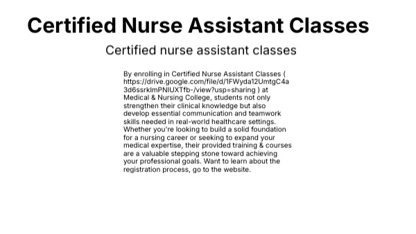 By enrolling in Certified Nurse Assistant Classes ( https://drive.google.com/file/d/1FWyda12UmtgC4a3d6ssrklmPNIUXTfb-/view?usp=sharing ) at Medical & Nursing College, students not only strengthen their clinical knowledge but also develop essential communication and teamwork skills needed in real-world healthcare settings. Whether you're looking to build a solid foundation for a nursing career or seeking to expand your medical expertise, their provided training & courses are a valuable stepping stone toward achieving your professional goals. Want to learn about the registration process, go to the website.