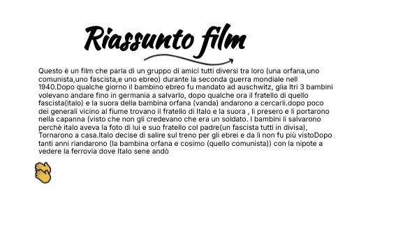 Secondo me questo film è molto bello perchè evidnzia l'amiciziae l'ugualianza, viene ambientato a roma (proprio nella capitale).E mi piace il coraggio di Italo🎉