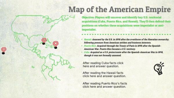 Objective: Players will uncover and identify key U.S. territorial acquisitions (Cuba, Puerto Rico, and Hawaii). They’ll then defend their positions on whether these acquisitions were imperialist or anti-imperialist.