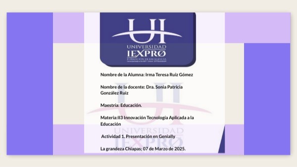 Nombre de la Alumna: Irma Teresa Ruiz Gómez Nombre de la docente: Dra. Sonia Patricia González Ruiz Maestría: Educación. Materia:II3 Innovación Tecnología Aplicada a la Educación Actividad 1. Presentación en Genially La grandeza Chiapas; 07 de Marzo de 2025. Fecha y lugar de elaboración: La grandeza Chiapas a 11 septiembre 2024