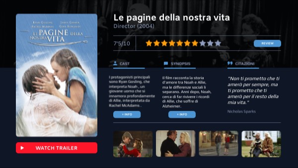 "Le pagine della nostra vita" è un film del 2004 tratto dall’omonimo romanzo di Nicholas Sparks pubblicato nel 1996. La storia è ispirata ai nonni della moglie dell’autore e ambientata negli anni ‘40 in North Carolina. Il libro esplora temi come il vero amore, il destino e il potere dei ricordi. Con il suo stile emozionante e coinvolgente, ha conquistato milioni di lettori ed è diventato un bestseller internazionale.
