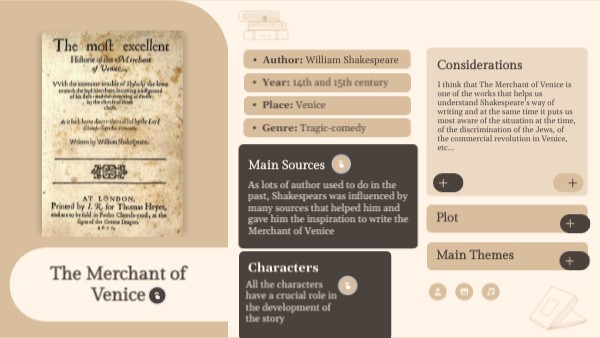 I think that The Merchant of Venice is one of the works that helps us understand Shakespeare's way of writing and at the same time it puts us most aware of the situation at the time, of the discrimination of the Jews, of the commercial revolution in Venice, etc...