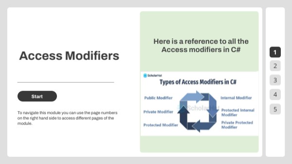 Here is a quick overview of Access Modifiers that you have learnt from this module.