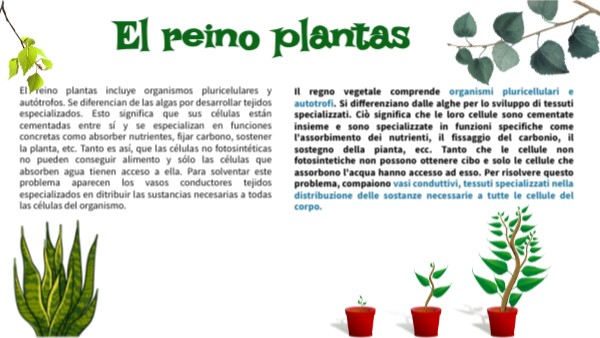 El reino plantas incluye organismos pluricelulares y autótrofos. Se diferencian de las algas por desarrollar tejidos especializados. Esto significa que sus células están cementadas entre sí y se especializan en funciones concretas como absorber nutrientes, fijar carbono, sostener la planta, etc. Tanto es así, que las células no fotosintéticas no pueden conseguir alimento y sólo las células que absorben agua tienen acceso a ella. Para solventar este problema aparecen los vasos conductores tejidos especializados en ditribuir las sustancias necesarias a todas las células del organismo.
