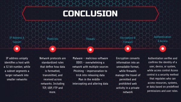 Malware - malicious software DDOS - overwhelming a network with multiple sources Phishing - impersonation to trick into releasing data Man in the middle - intercepting and altering data