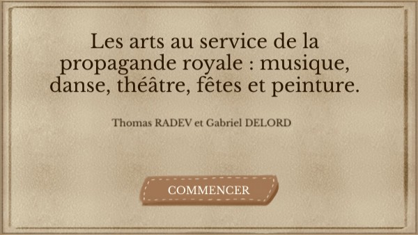 Les arts au service de la propagande royale : musique, danse, théâtre, fêtes et peinture.