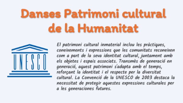 El patrimoni cultural inmaterial inclou les pràctiques, coneixements i expressions que les comunitats reconeixen com a part de la seva identitat cultural, juntament amb els objetes i espais associats. Transmès de generació en generació, aquest patrimoni s'adapta amb el temps, reforçant la identitat i el respecte per la diversitat cultural. La Convenció de la UNESCO de 2003 destaca la necessitat de protegir aquestes expressions culturales per a les generaciones futures.
