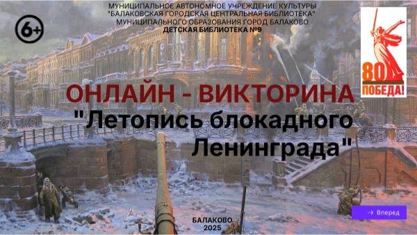 Твоему вниманию предлагается онлайн-викторина "Летопись блокадного Ленинграда", приуроченная к 80-летию Победы в Великой Отечественной войне. Ты сможешь проверить свои знания, а быть может узнать что-то новое о городе-герое блокадном Ленинграде. Правила просты, выбирай вопрос - всего их 15 (можно по порядку, а можно в хаотичном порядке) и вперед! Желаем удачи!