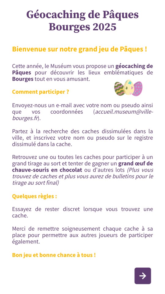 Cette année, le Muséum vous propose un géocaching de Pâques pour découvrir les lieux emblématiques de Bourges tout en vous amusant. Comment participer ? Envoyez-nous un e-mail avec votre nom ou pseudo ainsi que vos coordonnées (accueil.museum@ville-bourges.fr). Partez à la recherche des caches dissimulées dans la ville, et inscrivez votre nom ou pseudo sur le registre dissimulé dans la cache. Retrouvez une ou toutes les caches pour participer à un grand tirage au sort et tenter de gagner un grand œuf de chauve-souris en chocolat ou d'autres lots (Plus vous trouvez de caches et plus vous aurez de bulletins pour le tirage au sort final) Quelques règles : Essayez de rester discret lorsque vous trouvez une cache. Merci de remettre soigneusement chaque cache à sa place pour permettre aux autres joueurs de participer également. Bon jeu et bonne chance à tous !