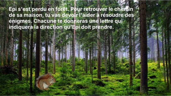 Epi s'est perdu en forêt. Pour retrouver le chemin de sa maison, tu vas devoir l'aider à résoudre des énigmes. Chacune te donneras une lettre qui indiquera la direction qu'Epi doit prendre.