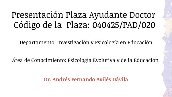 Presentación Plaza Ayudante Doctor Código de la Plaza: 040425/PAD/020