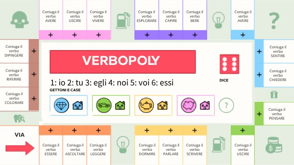 Ogni giocatore o squadra deve scegliere un colore tra blu, giallo, verde e rosa. I gettoni serviranno ad indicare la posizione e le 10 case le proprietà conquistate durante il gioco. All'inizio del gioco ogni giocatore si posizionerà sulla casella VIA del tabellone. Per iniziare a giocare cliccare sul dado e muoversi sul tabellone (il dado ha due funzioni: indica di quante caselle avanzare e quale persona utilizzare per coniugare i verbi. Il numero indicato corrisponde alla persona) In ciascuna casella ci sarà una prova da affrontare.... Rispondendo esattamente si possono mettere le proprie casette nelle caselle. Se si sbaglia si perdono le proprietà o si ritorna al via. Il giocatore o la squadra che ha il maggior numero di proprietà quando tutte le caselle sono occupate ha vinto.
