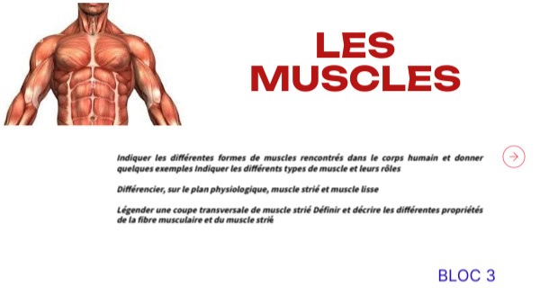 Indiquer les différentes formes de muscles rencontrés dans le corps humain et donner quelques exemples Indiquer les différents types de muscle et leurs rôles Différencier, sur le plan physiologique, muscle strié et muscle lisse Légender une coupe transversale de muscle strié Définir et décrire les différentes propriétés de la fibre musculaire et du muscle strié