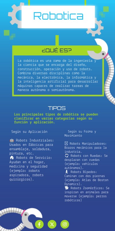 Según su Aplicación 🤖 Robots Industriales: Usados en fábricas para ensamblaje, soldadura, pintura, etc. 🏠 Robots de Servicio: Ayudan en el hogar, medicina y seguridad (ejemplo: robots aspiradora, robots quirúrgicos).