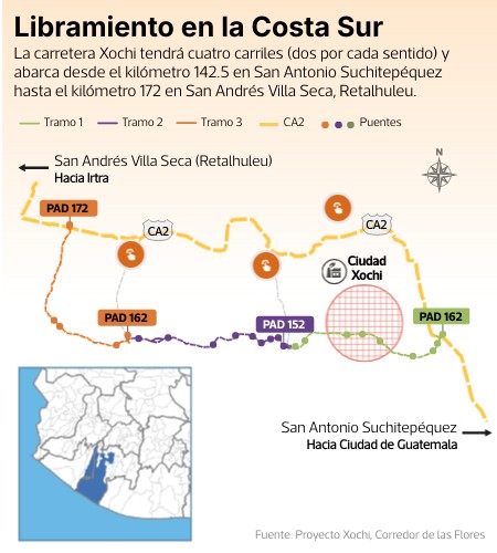 La carretera Xochi tendrá cuatro carriles (dos por cada sentido) y abarca desde el kilómetro 142.5 en San Antonio Suchitepéquez hasta el kilómetro 172 en San Andrés Villa Seca, Retalhuleu.