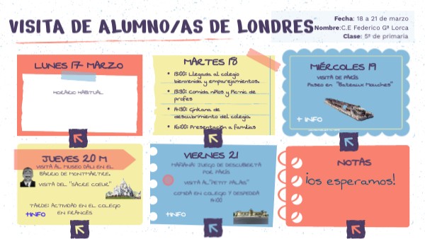 9:00 lLEGADA AL COLEGIO 9:30 SALIDA EN DIRECCIÓN AL BARRIO DE MONTMARTRE. 10:30 VISITA GUIADA DEL MUSEO DALI DE PARÍS 11:30 ALMUERZO Y RECREO 12:00 VISITA A LA BASÍLICA DEL "SACRE COEUR" 12:30 COMIDA EN EL BARRIO DE MONTMARTRE RECREO Y VUELTA AL COLEGIO 14:30 ACTIVIDAD CON EL EQUIPO DE FRANCÉS. 16:00 SALIDA DEL COLEGIO (FIN DE LA JORNADA)
