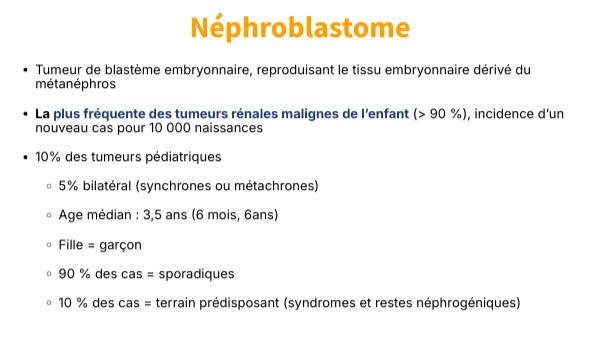- La plus fréquente des tumeurs rénales malignes de l’enfant (> 90 %), incidence d’un nouveau cas pour 10 000 naissances