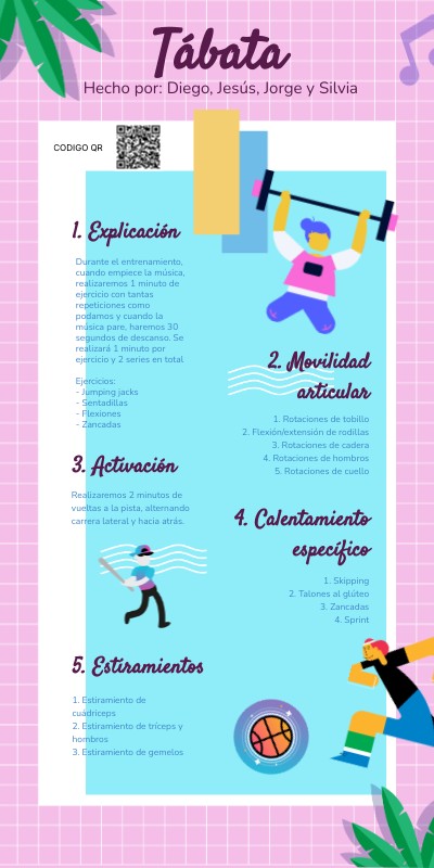 Durante el entrenamiento, cuando empiece la música, realizaremos 1 minuto de ejercicio con tantas repeticiones como podamos y cuando la música pare, haremos 30 segundos de descanso. Se realizará 1 minuto por ejercicio y 2 series en total Ejercicios: - Jumping jacks - Sentadillas - Flexiones - Zancadas
