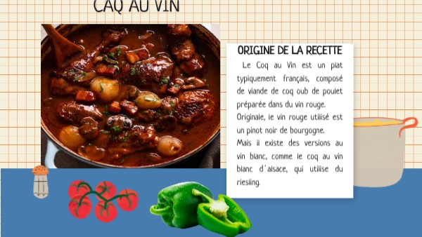Le Coq au Vin est un plat typiquement français, composé de viande de coq oub de poulet préparée dans du vin rouge.Originale, le vin rouge utilisé est un pinot noir de bourgogne. Mais il existe des versions au vin blanc, comme le coq au vin blanc d´alsace, qui utilise du riesling.