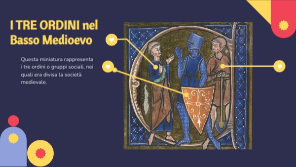 Questa miniatura rappresenta i tre ordini o gruppi sociali, nei quali era divisa la società medievale.