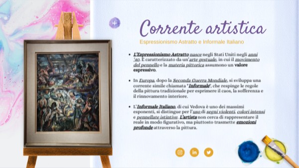 - L’Informale Italiano, di cui Vedova è uno dei massimi esponenti, si distingue per l’uso di segni violenti, colori intensi e pennellate istintive. L’artista non cerca di rappresentare il reale in modo figurativo, ma piuttosto trasmette emozioni profonde attraverso la pittura.