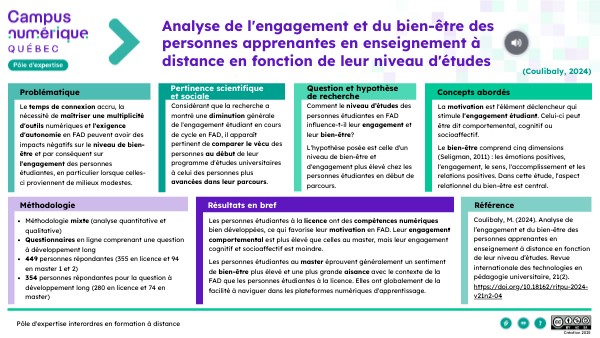 Pour citer ce document : Pôle d'expertise interordres en formation à distance (2025). Analyse de l'engagement et du bien-être des personnes apprenantes en enseignement à distance en fonction de leur niveau d'études [Fiche de lecture de Analyse de l'engagement et du bien-être des personnes apprenantes en enseignement à distance en fonction de leur niveau d'études par Coulibaly, M., 2024]. Campus numérique Québec. Licence CC BY-NC-SA. https://view.genially.com/67d2fb55718e2800823746df