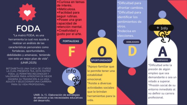 Betzabeth es una chica de 17años la cual presenta TEA, ESTA MATRIZ FODA, LE PERMITIRá reconocer y valorarse para afrontar de mejor manera su transiciÓn a la vida adulta y seleccionar una carrera para su vida profesional.