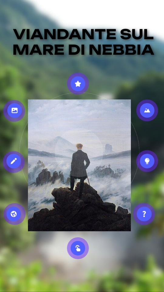 Titolo: Il viandante sul mare di nebbia (1818) Artista: Caspar David Friedrich Movimento artistico: Romanticismo Contesto storico: fine del XVIII secolo e inizio del XIX secolo, periodo di grandi cambiamenti sociali e politici in Europa