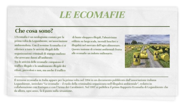 L'Ecomafia è un neologismo coniato per la prima volta da Legambiente, un’associazione ambientalista. Con il termine Ecomafia ci si riferisce a tutte le attività illegali delle organizzazioni criminali di stampo mafioso che arrecano danni all’ambiente. Tra le attività delle ecomafie compaiono il traffico illegale e lo smaltimento illegale dei rifiuti, pericolosi e non, ma anche il traffico