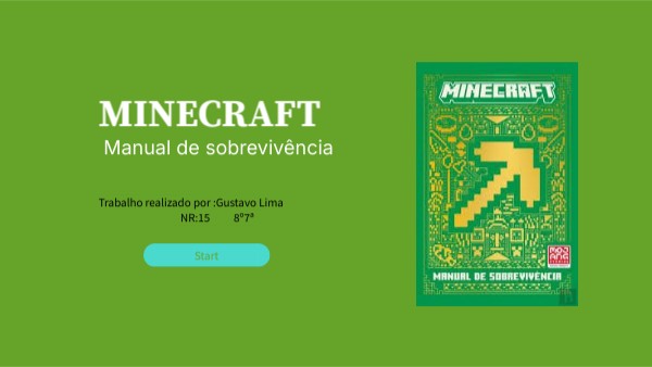 Manual de Sobrevivência é um guia essencial para iniciantes enfrentarem o mundo do jogo. Ele ensina como coletar recursos, construir abrigos, enfrentar mobs perigosos, como o creeper e que o seu maior medo são os gatos e explorar biomas. Com dicas de combate, minerar os 11 minérios e criação de ferramentas, ajuda os jogadores a sobreviverem e prosperarem nesse universo cheio de desafios.