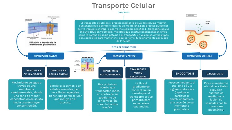 El transporte celular es el proceso mediante el cual las células mueven sustancias hacia dentro o fuera de su membrana. Este proceso puede ser activo (requiere energía) o pasivo (no requiere energía). El transporte pasivo incluye difusión y ósmosis, mientras que el activo implica mecanismos como la bomba de sodio-potasio o el transporte en vesículas. Ambos tipos son esenciales para mantener el equilibrio y el funcionamiento adecuado de la célula.