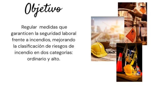 Regular medidas que garanticen la seguridad laboral frente a incendios, mejorando la clasificación de riesgos de incendio en dos categorías: ordinario y alto.