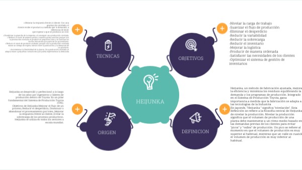Heijunka se desarrolló y perfeccionó a lo largo de los años por ingenieros y líderes de producción dentro de Toyota. Es un pilar fundamental del Sistema de Producción Toyota (TPS). Objetivos de Heijunka Mejorar el flujo de un proceso, Reducir el desperdicio, Disminuir o abandonar el procesamiento por lotes, Mejorar la respuesta frente al cliente, Evitar la sobrecarga de los procesos productivos. Heijunka se utiliza en todos los sectores a escala mundial.