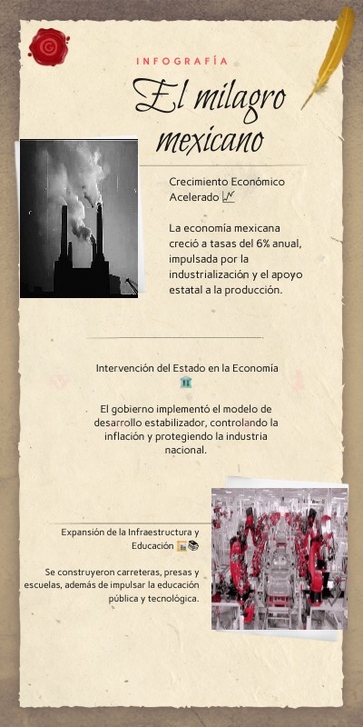 Crecimiento Económico Acelerado 📈 La economía mexicana creció a tasas del 6% anual, impulsada por la industrialización y el apoyo estatal a la producción.