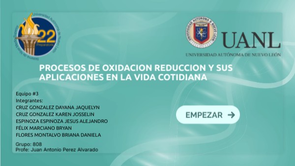Brayan: En conclusión, los procesos de oxidación-reducción (redox) en las celdas electroquímicas tienen un papel fundamental en la vida cotidiana, la industria y el medio ambiente. Gracias a la electroquímica, se pueden desarrollar soluciones más eficientes y ecológicas para las necesidades energéticas y de producción de la sociedad moderna.Karen: Los procesos de oxidación-reducción en las celdas electroquímicas tienen aplicaciones fundamentales en la vida y el entorno, tanto en el ámbito biológico como en el industrial. En los seres vivos, estos procesos son esenciales en la respiración celular y la fotosíntesis, permitiendo la obtención de energía y el mantenimiento de funciones vitales. En la industria, se utilizan en la producción de metales, baterías, tratamiento de aguas, corrosión y síntesis química, impactando en sectores como la energía, la salud y el medioambiente. Su estudio y aplicación contribuyen al desarrollo de tecnologías más sostenibles y eficientes. Daniela: Los procesos de oxidación implican la pérdida de electrones y son esenciales en la naturaleza y la industria. Pueden ser beneficiosos, como en la respiración celular, o dañinos, como en la corrosión. Su estudio permite controlarlos para aprovechar sus ventajas y minimizar sus efectos negativos. Jesus: Los procesos de oxidación-reducción en celdas electroquímicas son esenciales en la vida y la industria, ya que permiten obtener energía, fabricar materiales y proteger el medio ambiente, demostrando su importancia en el desarrollo y bienestar humano Dayana: En conclusión, los procesos de oxidación-reducción en las celdas electroquímicas son fundamentales tanto en la naturaleza como en la industria, ya que permiten la transferencia de energía en diversas formas y son esenciales para el funcionamiento de numerosos sistemas biológicos y tecnológicos.
