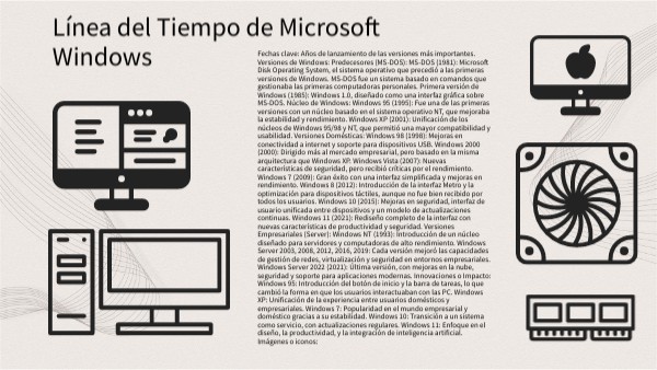 Fechas clave: Años de lanzamiento de las versiones más importantes. Versiones de Windows: Predecesores (MS-DOS): MS-DOS (1981): Microsoft Disk Operating System, el sistema operativo que precedió a las primeras versiones de Windows. MS-DOS fue un sistema basado en comandos que gestionaba las primeras computadoras personales. Primera versión de Windows (1985): Windows 1.0, diseñado como una interfaz gráfica sobre MS-DOS. Núcleo de Windows: Windows 95 (1995): Fue una de las primeras versiones con un núcleo basado en el sistema operativo NT, que mejoraba la estabilidad y rendimiento. Windows XP (2001): Unificación de los núcleos de Windows 95/98 y NT, que permitió una mayor compatibilidad y usabilidad. Versiones Domésticas: Windows 98 (1998): Mejoras en conectividad a internet y soporte para dispositivos USB. Windows 2000 (2000): Dirigido más al mercado empresarial, pero basado en la misma arquitectura que Windows XP. Windows Vista (2007): Nuevas características de seguridad, pero recibió críticas por el rendimiento. Windows 7 (2009): Gran éxito con una interfaz simplificada y mejoras en rendimiento. Windows 8 (2012): Introducción de la interfaz Metro y la optimización para dispositivos táctiles, aunque no fue bien recibido por todos los usuarios. Windows 10 (2015): Mejoras en seguridad, interfaz de usuario unificada entre dispositivos y un modelo de actualizaciones continuas. Windows 11 (2021): Rediseño completo de la interfaz con nuevas características de productividad y seguridad. Versiones Empresariales (Server): Windows NT (1993): Introducción de un núcleo diseñado para servidores y computadoras de alto rendimiento. Windows Server 2003, 2008, 2012, 2016, 2019: Cada versión mejoró las capacidades de gestión de redes, virtualización y seguridad en entornos empresariales. Windows Server 2022 (2021): Última versión, con mejoras en la nube, seguridad y soporte para aplicaciones modernas. Innovaciones o Impacto: Windows 95: Introducción del botón de inicio y la barra de tareas, lo que cambió la forma en que los usuarios interactuaban con las PC. Windows XP: Unificación de la experiencia entre usuarios domésticos y empresariales. Windows 7: Popularidad en el mundo empresarial y doméstico gracias a su estabilidad. Windows 10: Transición a un sistema como servicio, con actualizaciones regulares. Windows 11: Enfoque en el diseño, la productividad, y la integración de inteligencia artificial. Imágenes o iconos: