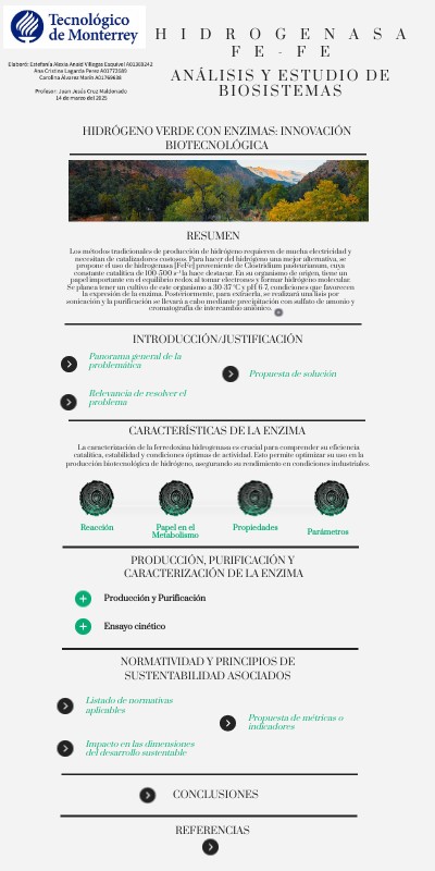 Los métodos tradicionales de producción de hidrógeno requieren de mucha electricidad y necesitan de catalizadores costosos. Para hacer del hidrógeno una mejor alternativa, se propone el uso de hidrogenasa [FeFe] proveniente de Clostridium pasteurianum, cuya constante catalítica de 100-500 s⁻¹ la hace destacar. En su organismo de origen, tiene un papel importante en el equilibrio redox al tomar electrones y formar hidrógeno molecular.Se planea tener un cultivo de este organismo a 30-37 °C y pH 6-7, condiciones que favorecen la expresión de la enzima. Posteriormente, para extraerla, se realizará una lisis por sonicación y la purificación se llevará a cabo mediante precipitación con sulfato de amonio y cromatografía de intercambio aniónico.