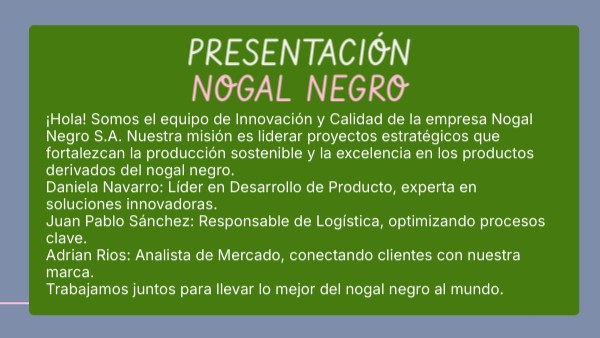 ¡Hola! Somos el equipo de Innovación y Calidad de la empresa Nogal Negro S.A. Nuestra misión es liderar proyectos estratégicos que fortalezcan la producción sostenible y la excelencia en los productos derivados del nogal negro. Daniela Navarro: Líder en Desarrollo de Producto, experta en soluciones innovadoras. Juan Pablo Sánchez: Responsable de Logística, optimizando procesos clave. Adrian Rios: Analista de Mercado, conectando clientes con nuestra marca. Trabajamos juntos para llevar lo mejor del nogal negro al mundo.