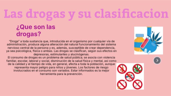 “Droga” a toda sustancia que, introducida en el organismo por cualquier vía de administración, produce alguna alteración del natural funcionamiento del sistema nervioso central de la persona y es, además, susceptible de crear dependencia, ya sea psicológica, física o ambas. Las drogas se clasifican, según sus efectos en depresoras, estimulantes y alucinógenas. El consumo de drogas es un problema de salud pública; se asocia con violencia familiar, escolar, laboral y social, disminución de la salud física y mental, así como de la calidad y el tiempo de vida, en general, afecta a toda la población, aunque representa mayor peligro para niños y jóvenes. Los factores de riesgo involucrados en el consumo son variados. Estar informados es la mejor herramienta para la prevención.