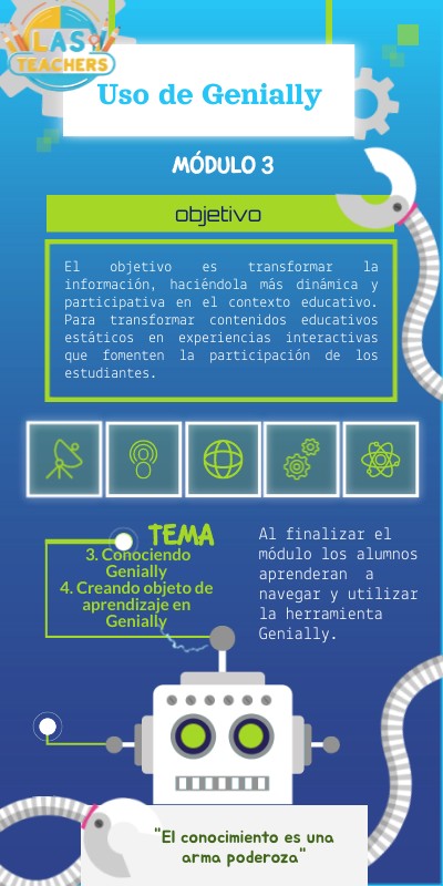 Al finalizar el módulo los alumnos aprenderan a navegar y utilizar la herramienta Genially.