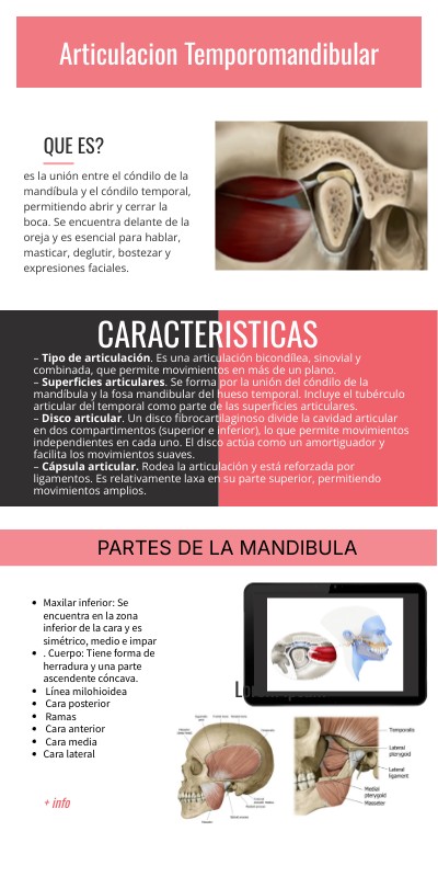 es la unión entre el cóndilo de la mandíbula y el cóndilo temporal, permitiendo abrir y cerrar la boca. Se encuentra delante de la oreja y es esencial para hablar, masticar, deglutir, bostezar y expresiones faciales.