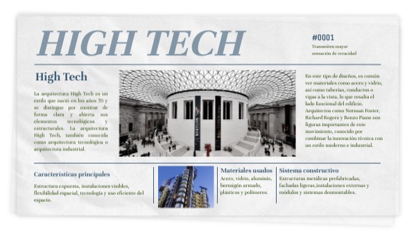 La arquitectura High Tech es un estilo que nació en los años 70 y se distingue por mostrar de forma clara y abierta sus elementos tecnológicos y estructurales. La arquitectura High Tech, también conocida como arquitectura tecnológica o arquitectura industrial.