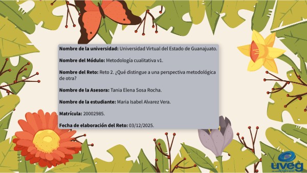 Nombre de la universidad: Universidad Virtual del Estado de Guanajuato. Nombre del Módulo: Metodología cualitativa v1. Nombre del Reto: Reto 2. ¿Qué distingue a una perspectiva metodológica de otra? Nombre de la Asesora: Tania Elena Sosa Rocha. Nombre de la estudiante: Maria Isabel Alvarez Vera. Matrícula: 20002985. Fecha de elaboración del Reto: 03/12/2025.