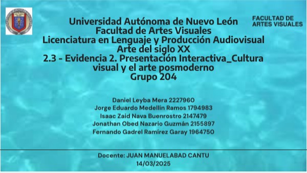 Universidad Autónoma de Nuevo León Facultad de Artes Visuales Licenciatura en Lenguaje y Producción Audiovisual Arte del siglo XX 2.3 - Evidencia 2. Presentación Interactiva_Cultura visual y el arte posmoderno Grupo 204