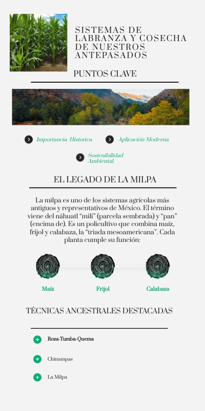 Cultivo base: Maíz, frijol y calabaza.Beneficios: Mayor biodiversidad, ahorro de agua y resiliencia frente a plagas. Enfoque ecológico: Uso mínimo de fertilizantes y pesticidas, protección del suelo y producción de alimentos nutritivos.